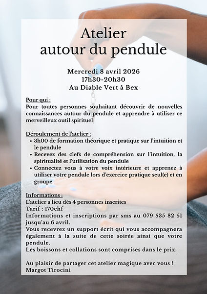 J'ai obtenu mon diplôme de formatrice en 2014. Les thèmes sont variés : La relation à mon corps, Cocooning, la relation à l’argent, Célébrer l’Année qui s’achève, Accueillir la Nouvelle Année… entre autres. Possibilités d’organiser des ateliers sur demande pour diverses occasions. (Anniversaire, Mariage, Projet de groupe, Maternité etc…)